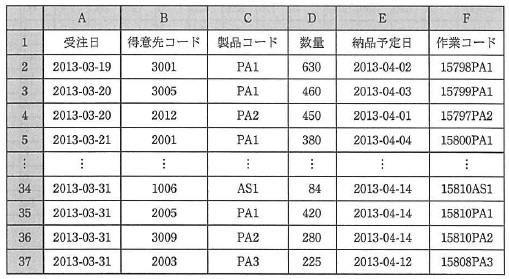 図1 ワークシート“部品一覧” 〔ワークシート:受注一覧〕 ワークシート“受注一覧”には,受注データのデータベースから,生産基準数を 決定する週及びその翌週に納品予定日を迎えるデータを抽出し,受注日順に格納した後, 作業コードを付与する。ワークシート“受注一覧”の例を,図2に示す。