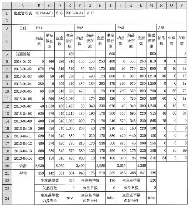 記述中の (1) セル B1 には,生産管理の開始日を,セル E1 には,開始日から数えて 14 日目の 日付を表示する式を入力し,この間を生産管理期間とする。また, セル A6〜A19 には,生産管理期間中の一連の日付を表示する式を入力する。 (2) セル B3,F3,J3,N3 には,製品コードを入力する。 (3) セル E5,I5,M5,P5 には,各製品の前週末の実際の在庫数を入力する。 (4) セル E22,I22,M22 には,製品 PA1,PA2,PA3 の生産基準数を, 最大生産数を超えない範囲で入力する。 (5) セル N6 には,納品予定日がセル A6 の日付の製品 AS1 の納品数を求める式を 入力し,セル N7〜N19 に複写する。 (6) セル B6 には,納品予定日がセル A6 の日付であり,製品コードがセル B3 の コードである製品の納品数を求める次の式を入力し,セル B7〜B19, セル F6〜F19,セル J6〜J19 に複写する。