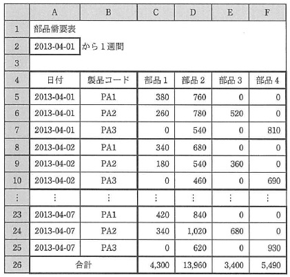 設問3 A社では,部品の仕入計画を立案するために,ワークシート “生産管理”でマクロ Product_sim を実行して求めた生産数を基に, 1週間の生産に必要な部品数を求めるワークシート“部品需要”を図4の例のように作成した。 ワークシート“部品需要”に関する次の記述中の に