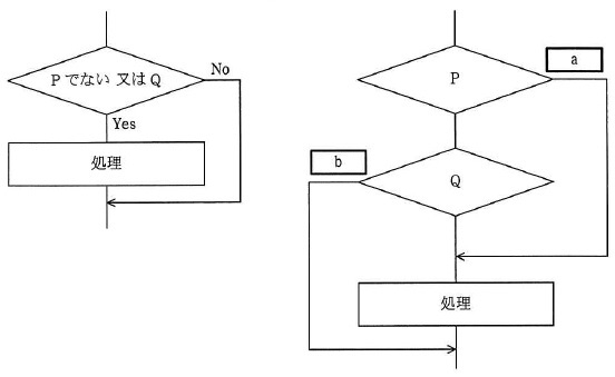 右の流れ図で、上の判定で右側に行った時に処理をするので、 空欄 a は、「No」が入る。また、上の判定で下に行った時に処理をするので、 空欄 b は、「No」が入る。