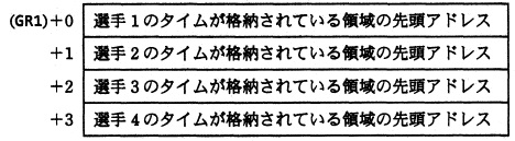 (1) 主プログラムから,図2に示すデータが格納されている領域の先頭アドレスが GR1 に 設定されて渡される。4名の選手のタイムは図1に示す数字列の時間の形式で格納されている。