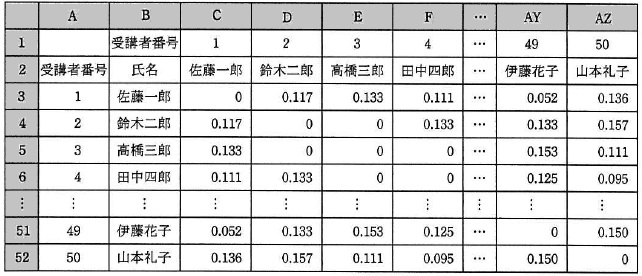 問13 表計算問13 次の表計算のワークシート及びマクロの説明を読んで,設問1,2に答えよ。 〔表計算の説明〕 ある科目を受講する学生を,知人関係の情報に基づいてグループ分けするプログラムを表計算ソフトで作成した。 グループ分けする対象の学生は 50 人である。グループはそれぞれ 10 人で,各グループには あらかじめ1人のグループ長が決められている。 〔ワークシート:知人関係類似度行列〕 任意の2学生の知人関係の情報を表現した“知人関係類似度行列”を作成した。 ワークシート“知人関係類似度行列”の例を図1に示す。