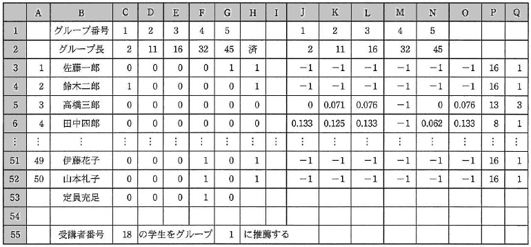 ![]() 図2 ワークシート“グループ分け” (1) セル A3 〜 A52 には,1から順番に受講者番号を入力する。セル B3 〜 B52 には, 受講者番号に対応する氏名を入力する。 (2) セル C1 〜 G1 には,1から順番にグループ番号を入力する。 (3) セル C2 〜 G2 には,各グループのグループ長の受講者番号を入力する。 (4) セル C3 〜 G52 には,それぞれの学生(グループ長を含む)が,対応するグループに 割り当てられている場合は1を,そうでない場合には 0 を入力する。 (5) セル H3 〜 H52 には,対応する学生が既にいずれかのグループに 割り当てられている場合は 1 が,そうでない場合は 0 が表示される。 (6) セル C53 〜 G53 には,対応するグループに割り当てられた学生が 10 人であれば 1 が, そうでない場合は 0 が表示される。 (7) 本ワークシートは,グループ分け作業を支援するための推薦機能を有している。 どのグループにも割り当てられていない学生と,所属する人数が 10 人に達していないグループ のグループ長との組合せの中で,類似度が最大となる組合せを抽出し,その組合せに含まれる学生の 受講者番号とグループ長が属するグループ番号を行 55 に表示する。ただし, 類似度が最大となる組合せが複数ある場合,次の優先順で最も優先度が高い組合せを表示する。 A @に該当する組合せが複数存在する場合,その中でグループ長が属するグループ番号が最も小さい組合せ