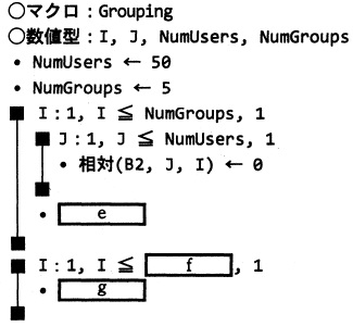 マクロ Grouping 中の 〔マクロ:Grouping〕 ![]() e,g に関する解答群 イ 相対(B2,C55,G55) ← 1 ウ 相対(B2,I,G55) ← 1 エ 相対(B2,I,相対(B2,0,I)) ← 1 オ 相対(B2,I,相対(B2,C55,I)) ← 1 カ 相対(B2,相対(B2,0,I),I) ← 1 キ 相対(B2,相対(B2,C55,I),I) ← 1 ク 相対(B2,相対(B2,0,G55),I) ← 1 f に関する解答群 ウ NumUsers エ NumUsers * (NumGroups − 1) オ NumUsers * NumGroups カ NumUsers + NumGroups キ NumUsers − NumGroups ク NumUsers / NumGroups