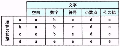 表は,文字列を検査するための状態遷移表である。検査では,初期状態を a とし,
