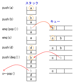問07 キューとスタック空の状態のキューとスタックの二つのデータ構造がある。 次の手続を順に実行した場合,変数 x に代入されるデータはどれか。 ここで,手続で引用している関数は,次のとおりとする。 push( y ): データ y をスタックに積む。 pop() :データをスタックから取り出して,その値を返す。 enq( y ) :データ y をキューに挿入する。 deq() :キューからデータを取り出して,その値を返す。 [手続] push(a) push(b) enq(pop()) enq(c) push(d) push(deq()) x ← pop() 解説