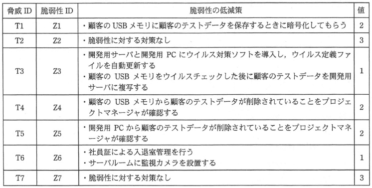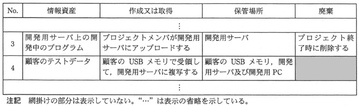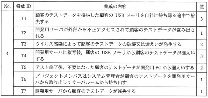 図1 Z社のリスクアセスメントの手順 〔プロジェクトYの説明(抜粋)〕 (1) 顧客が利用する購買システムを開発する。 (2) 開発で利用するテストデータは顧客から提供される。 (3) 顧客のテストデータを格納した顧客の USB メモリを,プロジェクトメンバが 顧客から受け取って自社に持ち帰り,顧客のテストデータを開発用サーバに複写後, USB メモリから削除する。 (4) Z社から顧客の事務所を訪問するのに,電車で1時間 30 分ほど要する。 (5) 開発用 PC でプログラムを開発し,適宜,開発用サーバにアップロードする。 〔Z社の開発環境(抜粋)〕 (1) プログラムの開発には,開発用サーバと開発用 PC を利用する。 (2) 開発用サーバは,施錠されたサーバルームに設置されている。 (3) 開発用サーバは,アクセス管理がされており,プロジェクトメンバと システム管理者だけがアクセスできる。 (4) 開発用 PC は,プロジェクト開始時にシステム部から各プロジェクトメンバに貸与され, プロジェクト終了時に返却される。 〔Z社の開発標準(抜粋)〕 (1) 開発時,プロジェクトメンバは顧客のテストデータのうち必要なものだけを, 開発用サーバから自分の開発用PCにダウンロードし,不要になったら削除する。 (2) プロジェクト終了時に,プロジェクトマネージャは開発用サーバの顧客のテストデータを 削除し,全ての開発用PCから顧客のテストデータが削除されていることを確認する。 〔Z社のリスク値算出方法〕 Z社では,各情報資産のリスク値を,次の式で算出する。