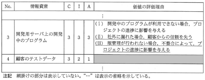 表1 情報資産の洗出し A 情報資産の価値の数値化 表1の各情報資産に対して,C,I,Aのそれぞれについてその価値を評価した値と 評価理由を,表2に示す。