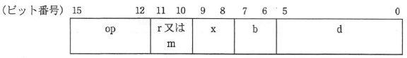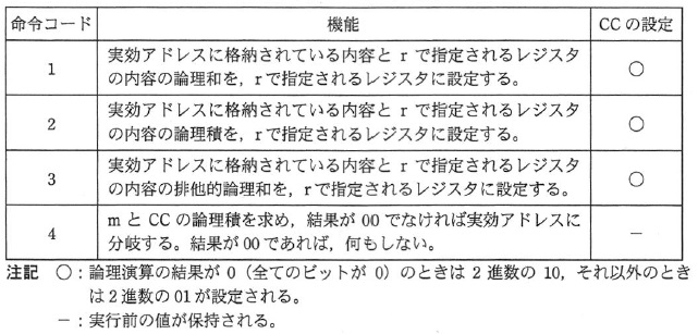 (1) この命令語を実行するコンピュータの1語は 16 ビットであり,1語長のレジスタを 4個(レジスタ番号0〜3)と,命令の実行結果によって値が設定される2ビットの 条件コードレジスタ(以下,CC という)をもつ。 (2) 実効アドレスは,表2に示す式で算出される。ここで,(x) と (b) は,それぞれ x と b で 指定されるレジスタに設定されている内容(以下,レジスタの内容という)を示す。