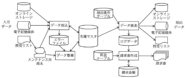 図1 名簿データ管理システムの処理フロー図 〔処理フロー図の説明〕 名簿データ管理システムは,名簿の提供者から受領する名簿データを取り込み, データを整備し,名簿データの利用者からの要求に応じて,データを抽出する。 また,利用者から,抽出件数に応じた利用料金を徴収するための請求書を作成する。 システムの処理ごとに,その説明を示す。 (1) データ取込処理では,入力データを基にレコードを編集し,名簿マスタを更新する。 入力インタフェースとして“オンライン接続(オンラインストレージサービスの利用)”, “電子記憶媒体授受”及び“授受リストを基にしたメンテナンス用端末からの入力” の3種類が用意されている。名簿マスタの更新ができなかったデータは, エラーファイルに出力する。 (2) データ整備処理では,名簿マスタ更新時のエラーファイルを基に, メンテナンス用端末を使用して, レコードを編集し,名簿マスタを更新する。 (3) データ抽出処理では,名簿マスタ及び抽出条件テーブルを参照し,目的のレコードを 抽出して出力する。出力インタフェースとして“オンライン接続(オンラインストレージサービスの利用)”, “電子記憶媒体授受”及び“授受リスト”の3種類が用意されている。 また,利用者ごとのデータ抽出処理の実行と抽出件数に関するログデータを出力する。 (4) 請求書作成処理では,データ抽出処理で出力されたログデータ及び使用した出力インタフェースと データ抽出件数ごとに設定された料金テーブルを参照して,請求金額を算出する。 算出された請求金額を,請求レコード用フォーマットに編集して,請求書を出力する。 〔工数見積方法の説明〕 (1) 工数見積りには,A社でアレンジした簡易ファンクションポイント法を用いる。 簡易ファンクションポイント法は,ソフトウェアがもつ機能及び入出力インタフェースの数を基に, そのソフトウェアの開発規模を推定する手法である。図1で示す各処理の内容を, 機能及び入出力インタフェースごとに分類し,それぞれをファンクションとして定義する。 図1の処理フロー図から見積対象の処理ごとに,各ファンクションの個数を求める。 (2) 求められた各ファンクションの個数を基に,処理ごとの開発規模を求める。 名簿データ管理システムのファンクションとそれに対応する開発規模を表1に示す。 表1 ファンクション一覧