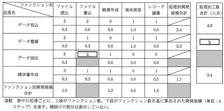 表3 処理ごとのファンクション数と開発規模一覧 a に関する解答群 b に関する解答群