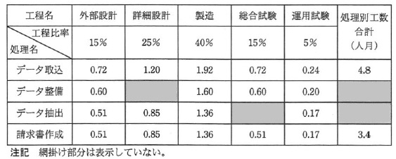 (3) 見積対象処理ごとに算出された開発規模と表2に示す開発生産性の計画値から, 工数を算出する。