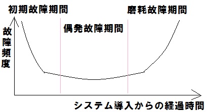 問15 故障面からのライフサイクルコンピュータシステムのライフサイクルを故障の面から,初期故障期間,偶発故障期間, 磨耗故障期間の三つの期間に分割するとき,初期故障期間の対策に関する記述として, 最も適切なものはどれか。 イ システムを構成するアイテムの累積動作時間によって経時保全を行う。 ウ 設計や製造のミスを減らすために,設計審査や故障解析を強化する。 エ 部品などの事前取替えを実施する。 解説