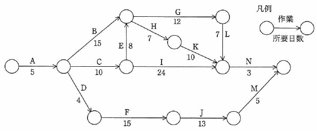 図に示すアローダイアグラムは,あるシステムの開発作業を表したものである。 クリティカルパスはどれか。