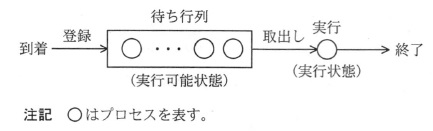 問03 4問選択問3 0S におけるプロセスのスケジューリングに関する次の記述を読んで, 設問1〜3に答えよ。 OS の役割の一つとして,プロセスに CPU を割り当てることがある。そして, プロセスに CPU を割り当てる順序(以下,実行順序という)を決定する方式には, 次のようなものがある。ここで,プロセスが実行されるコンピュータの CPU は 一つであり,CPU は同時に一つのプロセスしか実行できない。 (1) 到着順方式 プロセスを到着順に待ち行列の末尾に登録する。実行中のプロセスが終了すると 待ち行列の先頭からプロセスを一つ取り出して CPU を割り当て,実行を開始する。 到着順方式を図1に示す。待ち行列に登録されているプロセスの状態を実行可能状態, 実行中のプロセスの状態を実行状態と呼ぶ。