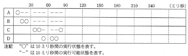プロセスの実行順序を決定する別の方式に残余処理時間順方式がある。 残余処理時間順方式は,一定の時間ごとに実行状態と実行可能状態にある プロセスの残余処理時間を比較し,その時間が最も短いプロセスに CPU を 割り当てる方式である。ここで,残余処理時間とは,プロセスの残りの処理が 完了するまでに必要な CPU の割当時間である。 表1に示すプロセス A 〜 D を,残余処理時間順方式で実行した場合の ターンアラウンドタイムについて考える。ターンアラウンドタイムとは, プロセスが最初に待ち行列に登録されてから処理が完了するまでの時間である。 プロセス A が登録されてから 10 ミリ秒ごとに残余処理時間を比較しながら 実行したとき,プロセス A,B,C のターンアラウンドタイムはそれぞれ ミリ秒, ミリ秒,