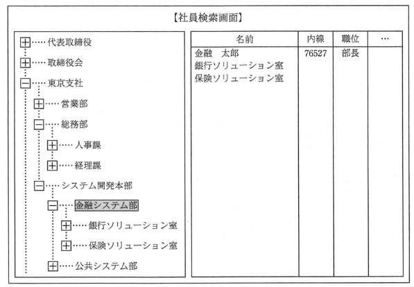 図1 社員検索機能の表示例 組織階層の扱いは,どの開発プロジェクトにおいても類似するものが多い。そこで, 組織階層を扱う機能をユーザインタフェースから切り離して, 様々な開発プロジェクトで再利用できるように,共通ライブラリとして設計することにした。 共通ライブラリは,オブジェクト指向で設計し,UML のクラス図で表現する。ここで, 共通ライブラリの設計に当たり,共通ライブラリを利用する側のソフトウェアを一律に クライアントと呼ぶことにする。 まず,分析のためのクラス図を作成した。 〔分析のためのクラス図の説明〕 組織階層において,ある組織が親の組織(以下,親組織という)をもつ場合, 親組織は必ず一つであり,子の組織(以下,子組織という)をもつ場合, 子組織の数に制限はない。また,親組織をもたない組織,子組織をもたない組織, 親組織も子組織ももたない組織もある。社員は必ず一つの組織だけに属する。 (1) 組織階層は木構造で管理する。 (2) クライアントが組織階層を参照する際,組織と社員を共通に扱えるようにするために, どちらも組織エントリとして管理する。 図2は,分析のためのクラス図である。