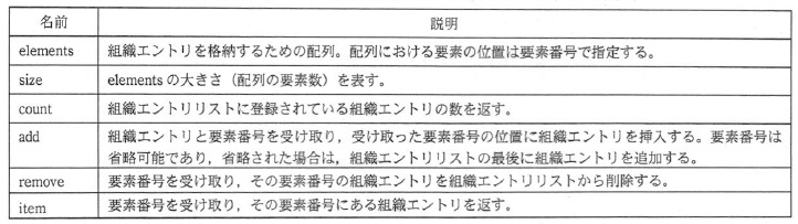 (1) 組織エントリリストは,組織エントリをサイズが可変の配列で管理する。 (2) クライアントは,組織エントリリストに表1のメソッドでアクセス(組織エントリの追加や削除, 取出し,走査など)する。