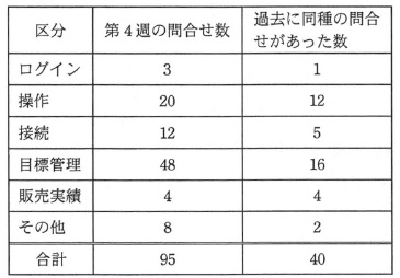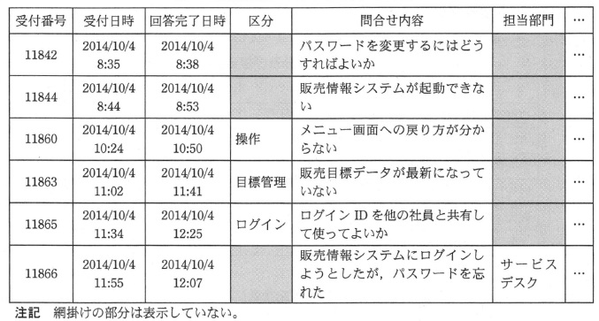 サービスデスクは,社員からの問合せの内容を表1に示す区分に従って分類し,