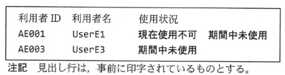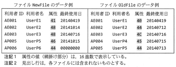 ここで,属性のビット r は,利用者 ID が使用可能なら 0,使用不可なら 1 である。 A NewFile 及び OldFile の両方にあって,最終使用日の値が等しい利用者 ID(全桁が“0”同士で等しい場合を含む) (3) 図3に,図1のデータ例を用いた実行結果を示す。
