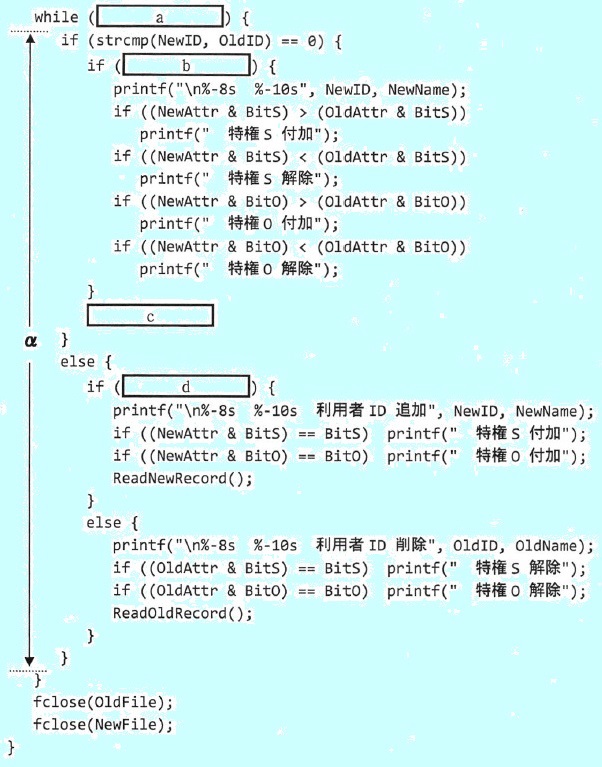 e,f に関する解答群 イ (NewAttr & BitR) == BitR ウ strcmp(NewDate,OldDate) == Ø エ strcmp(NewID, OldID) == Ø オ strcmp(NewID, OldID) == Ø && (NewAttr & BitR) == BitR カ strcmp(NewID, OldID) == Ø && Strcmp(NewDate, OldDate) == Ø