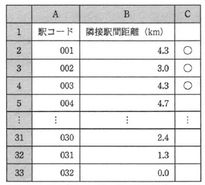 問13 表計算問13 次の表計算のワークシート及びマクロの説明を読んで,設問1,2に答えよ。 (表計算の説明〕 鉄道会社Y社では,表計算ソフトを使って乗車駅と降車駅を入力すると鉄道路線に おける駅間の距離(以下,乗車距離という)と運賃を表示するプログラムを作成した。 (1) 鉄道路線は,隣接駅間の距離(以下,隣接駅間距離という)が 5km を超えず, 分岐をもたない全長 94.2km の単一路線であり,起点駅から終点駅まで 32 の駅から成る。 (2) 各駅には“001”〜“032”の駅コードが割り付けられている。 (3) ワークシート“鉄道運賃”に乗車駅の駅コード(セル B1 )と降車駅の駅コード(セル B2 )を 入力すると,乗車距離(セル B3 )と運賃(セル B4 )が表示される。 乗車駅と降車駅の駅コードは,鉄道路線の各駅に割り付けられた駅コードのリストから 選択して入力するようになっている。ワークシート“鉄道運賃”の例を図1に示す。