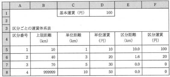 A 区分ごとの運賃体系表(セル A4 〜 D8 )のセル A5 〜 D8 には, 各区分の区分番号,上限距離,単位距離及び単位運賃が区分番号の昇順に格納されている。 B 区分番号4の上限距離には,999999 が格納されている。 C 列 E,F には,各区分の区分距離と区分運賃が表示される。 乗車駅から降車駅までの間(以下,乗車区間という)にある隣接駅間距離を選び出し, それらを合計したものを乗車距離とする。乗車距離(ワークシート“鉄道運賃”のセル B3 )を 求めるために,ワークシート“路線情報”と “鉄道運賃”に (1) 〜 (3) の手順で式の入力を行う。