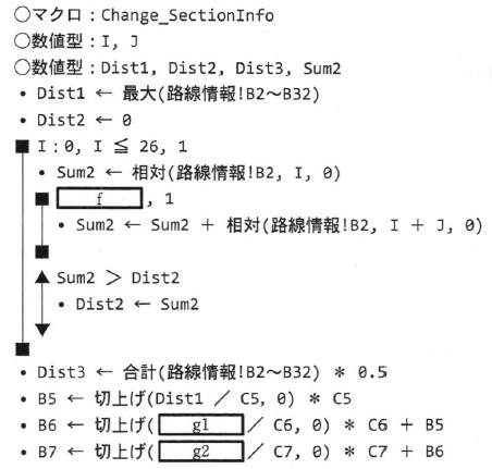 マクロ Change_SectionInfo に関する説明を読んで,マクロ中の 〔距離の範囲見直しの説明〕 (1) 少なくとも隣接駅間距離は,区分番号1の距離の範囲に入るようにする。 A 求めた距離の小数点以下を切り上げた値を,区分番号1の新たな上限距離とする。 A区分番号1の新たな上限距離に区分番号2の単位距離の倍数を加えた値でかつ, @で求めた距離以上となる最小値を,区分番号2の新たな上限距離とする。 A区分番号2の新たな上限距離に区分番号3の単位距離の倍数を加えた値で,かつ, @で求めた距離以上となる最小値を,区分番号3の新たな上限距離とする。 〔マクロ:Change_SectionInfo〕