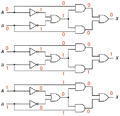 A、B の各値を図に示すディジタル回路に入力すると以下のようになる。 回路は、上下対象なので、0,1と1,0の出力は同じである。