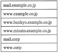 問04 4問選択ホスト名の衝突に関する次の記述を読んで,設問1,2に答えよ。 DNS(Domain Name System)は,ルートサーバを頂点とする多数の DNS サーバから 成る階層的な分散型データベースシステムであり,ホスト名と IP アドレスの変換に使用される。 A社は,一般に通用している自社ドメイン“example.co.jp”の他に, 正式な TLD(最上位のドメイン)として運用されていない“corp”を, 自社のネットワークだけで通用する独自の TLD として使っている。 自社ネットワークに設置している DNS サーバで,これら二つのドメインの ホスト名と IP アドレスの対応を管理している。 A社の DNS サーバで管理しているホスト名を,表1に示す。