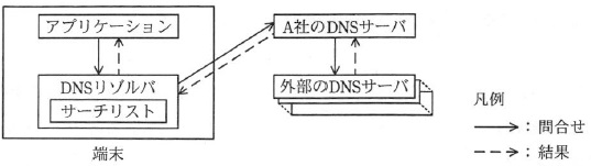 ホスト名に対応する IP アドレスを知りたいアプリケーションは,DNS リゾルバ (各端末で動作し,DNS サーバに IP アドレスの問合せを行うプログラム)に, ホスト名に対応する IP アドレスを問い合わせる。問合せを受けた DNS リゾルバは, A社の DNS サーバに問い合わせる。 問合せを受けた DNS サーバは,問い合わせられたホスト名が自分で管理している ホスト名であれば対応する IP アドレスを返す。そうでなければ外部の DNS サーバに 問い合わせ,その結果として得られた IP アドレス,又は見つからなかったことを 示すエラーのいずれかを返す(図1)。