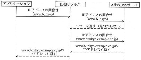 ![]() 図1 IP アドレスの問合せ A社では,ドメイン名を補完できるように,各端末の DNS リゾルバの設定で, A 社のドメイン“example.co.jp”をサーチリストに登録することを指示している。 このため,DNS リゾルバに問合せを行うアプリケーションは, ドメイン名“example.co.jp”を省略しても,ホスト名に対応する IP アドレスを 得ることができる。 例えば,ホスト名“www.bunkyo.example.co.jp”の IP アドレスを知りたいときは, ホスト名“www.bunkyo”で問い合わせれば,ホスト名“www.bunkyo.example.co.jp” の IP アドレスが,次のようにして得られる(図2)。ここで,“bunkyo”という TLD は 存在しないものとする。 @ アプリケーションが,DNS リゾルバにホスト名“www.bunkyo”の IP アドレスを 問い合わせる。 A DNS リゾルバは,A社の DNS サーバにホスト名“www.bunkyo”の IP アドレス を問い合わせる。 B ホスト名“www.bunkyo”に対応する IP アドレスが見つからないので, A社の DNS サーバは,エラーを DNS リゾルバに返す。 C エラーを受け取った DNS リゾルバは,ホスト名“www.bunkyo”に,サーチリストに 登録されたドメイン“example.co.jp”を連結したホスト名“www.bunkyo.example.co.jp”の IP アドレスをA社の DNS サーバに問い合わせる。 D A社の DNS サーバは,“www.bunkyu.exmple.co.jp”の IP アドレスを DNS リゾルバに返す。 E DNS リゾルバは,A社の DNS サーバから返された“www.bunkyo.example.co.jp”の IP アドレスをアプリケーションに返す。 ![]() 図2 サーチリストを利用した IP アドレスの問合せ 近年,多数の正式な TLD が追加されていて,これまでになかった新しい TLD が 運用されることによって,名前が衝突するリスクが高まっている。