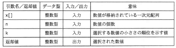 A 基準値 Pivot を選び,走査範囲内の値で基準値以下のものを左に, 基準値以上のものを右に集める(行番号 6 〜 24)。 B 走査範囲が基準値以下の値から成るグループと基準値以上の値から成るグループに分割されるので, k 番目に小さい値が含まれるグループを新たな走査範囲とする(行番号 25 〜 3Ø )。 C 繰返しが終了したときに,要素 x[k] の値が k 番目に小さい値として,選択される。 Select の引数と返却値の仕様は次のとおりである。