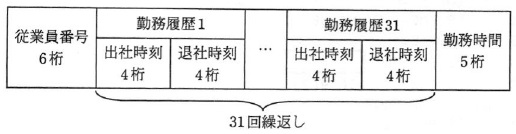 問10 COBOL次の COBOL プログラムの説明及びプログラムを読んで,設問1,2に答えよ。 (プログラムの説明〕 C社では,全従業員の出社時刻と退社時刻を入口のゲートで自動的に記録し, 出退勤記録ファイルに格納している。このプログラムは,1か月分の出退勤記録ファイルを 読み込み,出社した従業員の勤務管理ファイルに書き込むものである。 (1) 出退勤記録ファイルは,図1に示すレコード様式の順ファイルで,ある月の1か月分の 出退勤記録が格納されている。 ![]() 図1 出退勤記録ファイルのレコード様式 A 日付には,年,月, 日が,それぞれ 4 桁,2 桁,2 桁の西暦で格納されている。 B 時刻には,出社又は退社の時刻の時,分が,それぞれ 2 桁の 24 時間表記で格納されている。 C 出退勤フラグには,出社時は0が,退社時は1が格納されている。 D 従業員番号には,従業員ごとに一意な 6 桁の番号が格納されている。 E 同一従業員の出社時の記録と退社時の記録は,必ず対になっている。同じ日付のレコードは1組だけである。 F 出社時刻は 6 時から 22 時までである。退社時刻は同じ日付の 24 時までである。