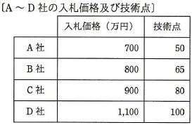 問66 総合評価落札方式を用いた調達総合評価落札方式を用い,次の条件で調達を行う。A 〜 D 社の入札価格及び技術点が表のとおりであるとき, 落札者はどれか。 〔条件〕 (1) 価格点( 100 点満点)及び技術点( 100 点満点)を合算した総合評価点が最も高い入札者を落札者とする。 (2) 予定価格を 1,000 万円とする。予定価格を超える入札は評価対象とならない。 (3) 価格点は次の計算式で算出する。 [1−(入札価格/予定価格)]× 100 ![]() 解説