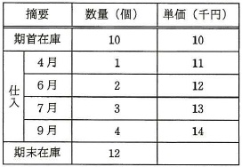 表から,期末在庫品を先入先出法で評価した場合の在庫評価額は何千円か。
