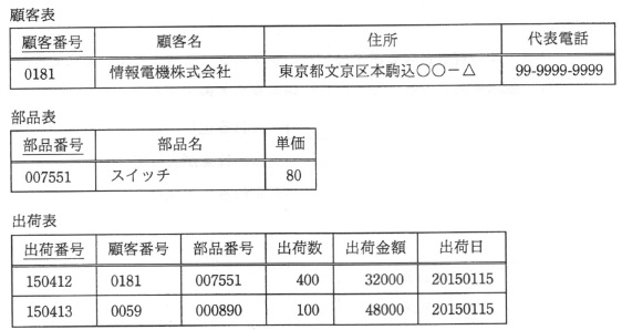 問03 4問選択電子部品の出荷データを管理する関係データベースの運用に関する次の記述を読んで, 設問1〜4に答えよ。 C社は,電子部品を製造販売する会社である。 ある期間に出荷した特定の電子部品について,製造装置の設定ミスによる不具合が 発生しているおそれがあるので,顧客への連絡と出荷済みの電子部品の 無償交換(回収及び再出荷。以下,リコールという)を実施することにした。 出荷情報は,図1に示す表で管理されている。下線付きの項目は主キーを表す。