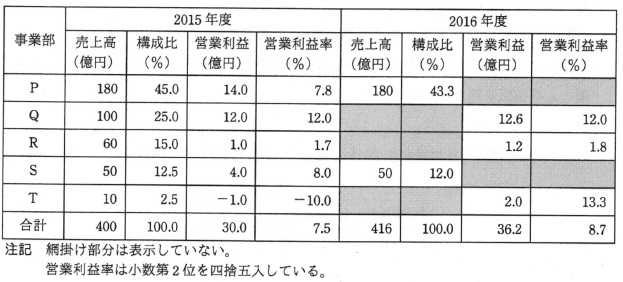 設問1 2016 年度の業績の予想に関する次の記述中の 表1,2を基に各事業部の 2016 年度の売上高と営業利益を予想した結果, 及び売上高の事業部構成比と各事業部の営業利益率を表3に示す。