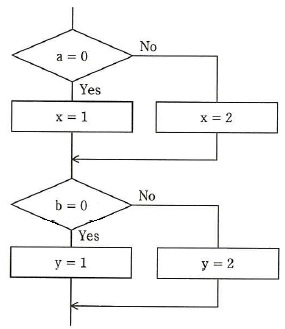 問題の流れ図では、a 値によって、x の値が変化し、b 値によって、y の値が変化するだけであるので、 以下の2つのケースをテストすれば十分である。