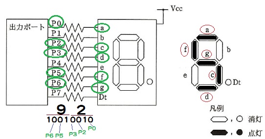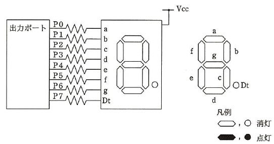 問21 7セグメントLED点灯回路アノードコモン型7セグメント LED 点灯回路で,出力ポートに 16 進数で 92 を出力したときの表示状態はどれか。 ここで,P7 を最上位ビット(MSB),P0 を最下位ビット(LSB)とし,ポートの出力が0のとき, LED は点灯する。