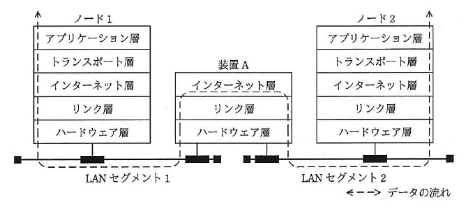 二つの LAN セグメントを接続する装置 A の機能を TCP/IP の階層モデルで表すと図のようになる。 この装置 A はどれか。