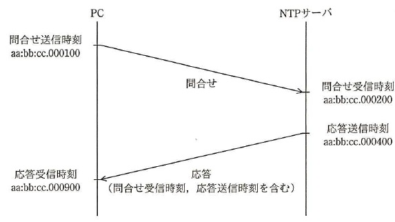 問34 NTPによる時刻合わせの仕組み図は NTP による時刻合わせの基本的な仕組みを表している。NTP サーバからの応答には, NTP サーバでの問合せ受信時刻と,応答送信時刻が含まれており, PC は図に示した四つの時刻からサーバ時刻とのずれを計算する。このとき, PC の内部時計は NTP サーバの時計と比べてどれだけずれているか。 ここで,伝送遅延は問合せと応答で等しいものとする。また,図中の時刻は, PC と NTP サーバのそれぞれの内部時計の時刻であり, aa:bb:cc:dddddd は aa 時 bb 分 cc.dddddd 秒( dddddd はマイクロ秒)を表す。 ![]() イ 200 マイクロ秒進んでいる。 ウ 500 マイクロ秒進んでいる。 エ 700 マイクロ秒進んでいる。 解説