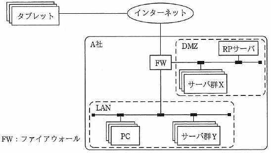 問01 必須問題販売支援システムの情報セキュリティに関する次の記述を読んで,設問1〜3に答えよ。 中堅の商社であるA社では,営業員が顧客先で営業活動を行い,自社に戻ってから見積書を作成している。 この度,営業員がタブレット端末(以下,タブレットという)を携帯し,顧客先で要求を聞きながら, タブレットを使って見積書を作成し,その場で顧客に提示できる 販売支援システムを構築することにした。 営業員は,タブレットの Web ブラウザからインターネット経由で HTTP over TLS(以下,HTTPS という)に よって販売支援システムにアクセスする。このとき,営業員は,社員 ID とパスワードを入力してログインする。 〔販売支援システムの構成〕 (1) 販売支援システムは次のサーバで構成され,A社のネットワークに設置される。 A アプリケーションソフトウェアが稼働する Web サーバ2台 B 見積書作成に必要なデータを格納するデータベースサーバ(以下,DB サーバという)1台 (3) DB サーバヘのアクセスの監視は,PC と同じ LAN にある監視サーバで行う。 (4) インターネットから販売支援システムヘの通信は,RP サーバを経由して行う。 RP サーバは,HTTPS を HTTP に変換し,販売支援システムの他のサーバと,HTTP で通信する。 A社のネットワーク構成を図1に示す。