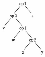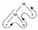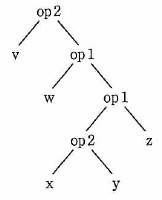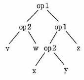 構文規則で規定されている式を例として,構文解析の処理を考える。式の構文解析では, 式を構成する演算子や名前などの字句を,式の左から右に読み込みながら, 字句の並びが構文規則で規定されている文法に合っているかどうかを解析し, その結果を構文木として出力する。 例えば,2項演算子 op,名前 v,w,x を構成要素とする式 v op w op x は, 次の演算順序@,Aになるように解釈され,その結果は, 図2に示す2分木で表現する構文木として出力される。図2の構文木では, 深さ優先でたどりながら,帰り掛けに節の演算子を評価する。 〔演算順序〕 @ v と w に対して演算 op を施す。 A @の結果と x に対して演算 op を施す。