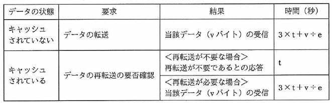 問04 4問選択Web 画面の表示に要するデータ転送時間に関する次の記述を読んで,設問に答えよ。 D社は,自社の Web サイトをインターネット上に公開している。 D社では, Web 画面1ページを構成する全データの転送に掛かる時間を, 5秒以内に収めるよう基準を定めている。個々のデータの転送に掛かる時間は, D社が定めたデータ転送時間計算モデルを基に算出する。 D社が定めたデータ転送時間計算モデルは,次のとおりである。 (1) ターンアラウンドタイム(ブラウザ,サーバ間で短いメッセージが往復するの に掛かる時間)t = 0.005(秒),実効転送速度(サーバ,ブラウザ間におけるデータ転送の速さ) e =1×106(バイト/秒)とする。 (2) ブラウザはキャッシュ機能をもっている。 Web 画面を表示する際に, 必要なデータがブラウザにキャッシュされているときは,サーバに当該データの再転送の 要否確認を要求する。再転送が必要な場合は,応答として当該データが転送される。 (3) ブラウザが,サーバに対して要求を送信し始めてから,要求に対する結果の受信が 完了するまでに掛かる時間を,表1に示す。 (4) 表1に関わる通信処理は逐次実行され,複数の通信処理が並行して行われることはない。 また,表1で示した時間以外は無視する。