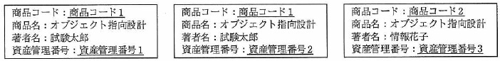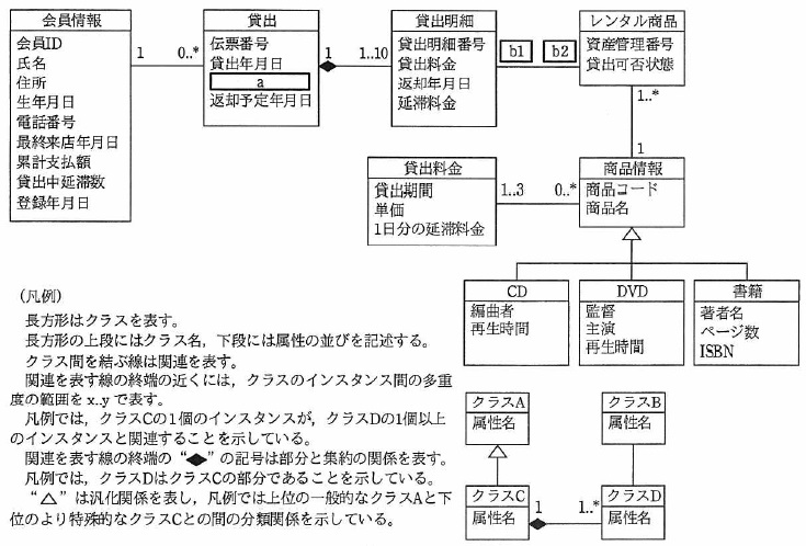 問05 4問選択レンタル業務システムの設計に関する次の記述を読んで,設問1〜3に答えよ。 E社は,レンタル業務システムを利用して,CD,DVD,書籍などの貸出し用の 各種資産(以下,レンタル商品という)をレンタルするサービスを行っている。 レンタル業務システムによるレンタル業務の概要は,次のとおりである。 〔レンタル業務の概要〕 (1) 会員登録の手順 A レンタル業務システムは,利用希望者に会員 ID を割り当て,会員 ID が 印字された会員カードを発行する。会員情報の属性である登録年月日と 最終来店年月日に本日日付を,累計支払額と貸出中延滞数に初期値として 0 を登録する。 ここで,累計支払額は会員登録時からの支払額の累計(延滞料金を含む)であり, 貸出中延滞数は現時点で返却予定年月日を過ぎているレンタル商品の件数である。 B 担当者は,レンタル業務システムから発行された会員カードを利用希望者に渡して, 会員登録が完了する。 E社は,全てのレンタル商品のそれぞれに,一意となる識別子として資産管理番号を 割り当てている。また,同じ種類のレンタル商品の情報(以下,商品情報という)ごとにも 一意となる識別子として商品コードを割り当てている。 図1は商品名が“オブジェクト指向設計”である3冊の書籍のレンタル商品に対して, 資産管理番号を三つ,商品コードを二つ,それぞれ割り当てた例である。