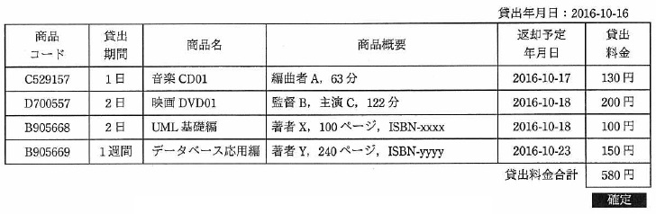 ![]() 図1 資産管理番号と商品コードを割り当てた例 A 担当者は,会員が提示した会員カードの会員 ID をレンタル業務システムに 入力して会員情報を画面に表示する。 B 担当者は,会員が貸出しを希望するレンタル商品に貼付された資産管理番号の バーコードをレンタル業務システムに読み込ませ,希望する貸出期間を会員から 聞いて, レンタル業務システムに入力する。ここで,貸出期間は1日,2日, 1週間のいずれかである。この作業を入力操作と呼ぶ。 C レンタル業務システムは,入力操作が行われる都度,レンタル商品の商品コード, 貸出期間,商品名,商品概要,返却予定年月日,貸出料金及び貸出料金合計を画面に表示する。 貸出料金はレンタル商品の種類ごとに貸出期間によって設定されている単価から, 返却予定年月日は貸出期間と本日日付から自動計算する。 D 担当者は,会員が貸出しを希望するレンタル商品の数だけ入力操作を繰り返す。 4件の入力操作を行った後の画面の表示例を,図2に示す。 E 担当者が,会員から貸出料金を受領した後,図2に示す確定ボタンを押すと, レンタル業務システムは,貸し出すレンタル商品ごとに貸出明細番号を 割り当てて貸出明細の情報として登録する。さらに,返却予定年月日ごとにまとめて, 伝票番号を割り当てて貸出の情報として登録する。図2の例では,貸出は3件, 貸出明細は4件を登録する。加えて,貸出明細とレンタル商品を関連付けて, レンタル商品の貸出可否状態を“貸出中”にする。 同時に会員情報の内容も更新する。その後,伝票番号ごとに貸出伝票を出力する。 F 担当者が,貸出しを希望するレンタル商品と貸出伝票を会員に渡すことで, レンタル商品の貸出しが完了する。 ![]() 図2 4件の入力操作を行った後の画面の表示例 (3) レンタル商品の返却手順 レンタル商品の返却では,貸出中の全てのレンタル商品が返却される場合と, 貸出中のレンタル商品の一部だけが返却される場合とがある。 A レンタル業務システムは,伝票番号,商品コード,商品名及び返却予定年月日を 画面に表示する。返却予定年月日を過ぎている場合は, 返却されるレンタル商品ごとに延滞料金を表示し,延滞料金の合計も表示する。 B 延滞料金が表示された場合,担当者は,会員から延滞料金を受領する。 C 担当者がレンタル商品の返却の確定ボタンを押すと,レンタル業務システムは, 貸出明細に関連付けたレンタル商品の貸出可否状態を“貸出可”にする。 同時に貸出明細と会員情報の内容を更新する。これによって, レンタル商品の返却が完了する。 レンタル業務システムは,閉店後に毎日,貸出中のレンタル商品の延滞チェックを行っており, 延滞が発生した場合は,会員情報の貸出中延滞数を更新する。 〔レンタル業務システムの UML 図〕 図3はレンタル業務システムのクラス図,図4はレンタル商品の貸出し手順に おけるBの操作が行われたときのシーケンス図である。 なお,図3のクラス図には,エンティティクラスだけを記載している。
