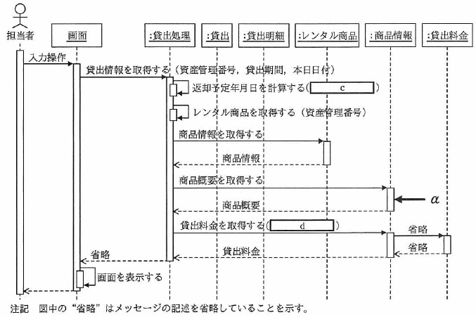 図4中の α の部分は,貸出処理クラスから商品情報クラスに対する商品概要を