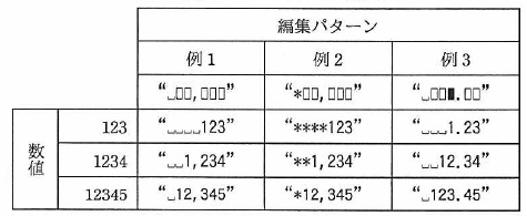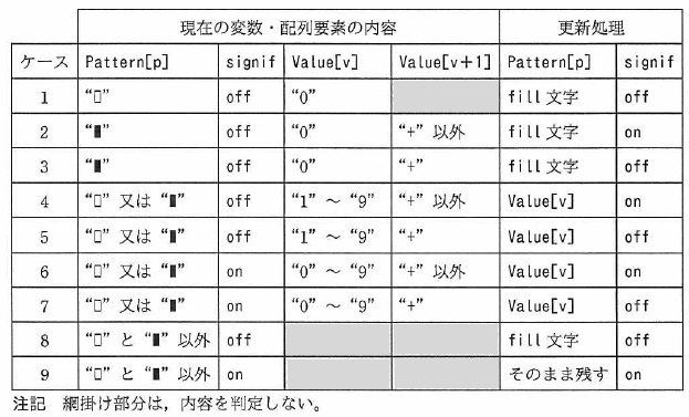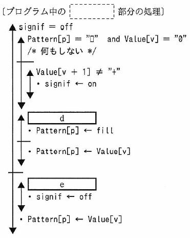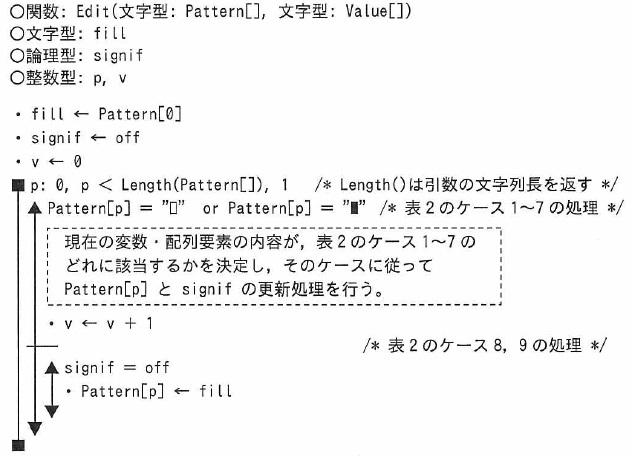 Pattern[] 中の文字 (4) 関数 Edit は,Value[] で与えられた数値を Pattern[] に従って編集し, 編集結果で Pattern[] を置き換える。 〔編集方法〕 Pattern[] 中の各文字について,先頭から順に1文字ずつ,次の@〜Bのいずれか一つの操作を実行していく。 @ 関数 Edit が呼び出されたときの Pattern[] 中の先頭の文字(以下,fill 文字という)で置き換える。 A Value[] 中の対応する桁の数字で置き換える。 B 置き換えないで,そのまま残す。 (5) 論理型変数 signif は,on 又は off の値を取る。この変数の実行開始時の値は off であり, Value[] 中に最上位から“0”が連続した後に“0”でない数字が見つかると on になる,などの使い方をする。 (6) 関数 Edit が呼び出されるとき,各引数には正しい値が設定されているものとする。 〔プログラム〕