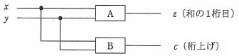 図に示す1桁の2進数 x と y を加算して,z(和の1桁目)及び c (桁上げ)を 出力する半加算器において,A と B の素子の組合せとして,適切なものはどれか。